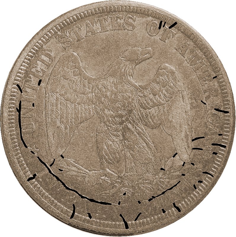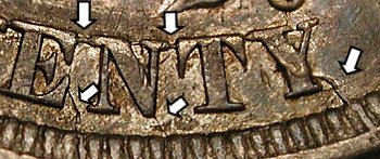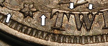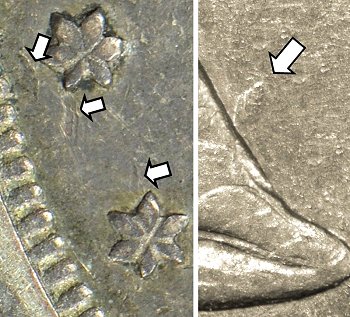 Die gouges are found near stars 1 and 2, and a diamond-shaped gouge is above Liberty’s foot.