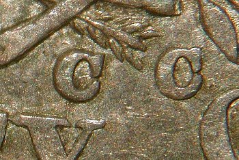 Mintmark has first C low and away from arrow, second C also low and centered between the arrow and the leaf. Both Cs are tilted to the right, with the first C tilted the most.