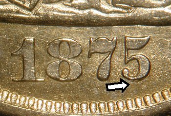 The right side of the 1 is under the shield point. This die has a minor recut 5, slightly doubled to the south.