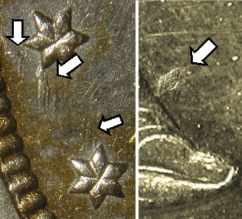 Die gouges are found near stars 1 and 2, and a diamond-shaped gouge is above Liberty’s foot.