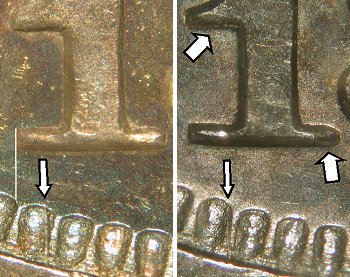 Oddly enough, there is a similar thin gouge or die line next to the same denticle below the 1, but it is minutely left of the one on Obverse 2! The top of this die line actually intrudes into the denticle itself. See comparison photos below for date and denticle die line placement.