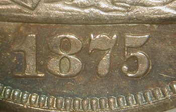 This new obverse die is almost identical to Obverse 2 found on BF-2. Like that die, the right side of the 1 in the date is under the shield point, although careful examination shows it is ever so slightly right of the date position of Obverse 2. This new obverse shows no repunching of the 1.