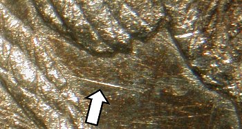 The other is a line underneath the eagle’s left (right facing) wing, to the right of its tail feathers (photo below). This line can be difficult to see in low-grade examples.