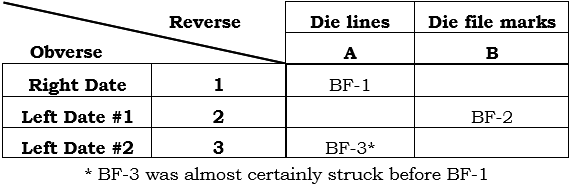 From an attribution perspective, the two “Left Date” obverses are almost identical, but this does not pose a difficulty for the collector, as the two different Left Date obverses are paired with different reverse dies. Therefore, a Left Date obverse paired with Reverse A is BF-3, and a Left Date obverse paired with Reverse B is BF-2. All Right Date coins seen thus far are the most common variety, BF-1.