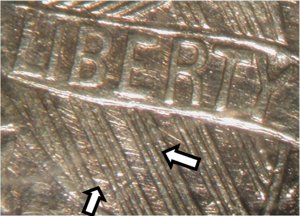 On high grade coins, horizontal raised die scratches or polish marks can be seen under LIBERTY on the shield.