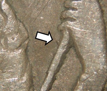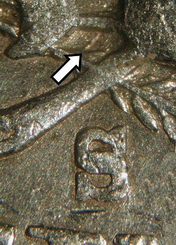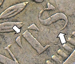 Two die markers make this obverse easy to identity, the first being the most obvious, even in low-grade coins. There is a die chip below the hand, on the left side of the pole.