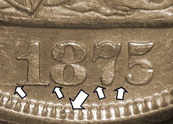 This die features a misplaced 1 low in the denticles below the date. The date also develops die cracks in later die states. The denticles appear weak on this die.