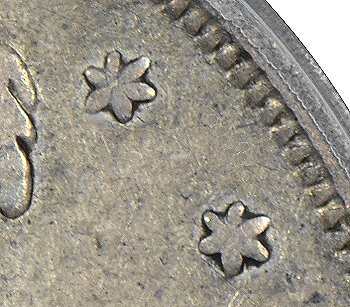This obverse features another misplaced date with the top of a misplaced 5 in the denticles below the date.