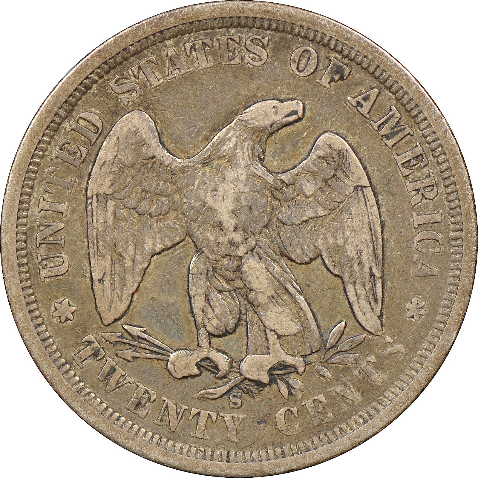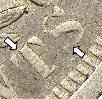 The branch mint proof die, with the diagonal die line on the reverse, and the left serif on T and lower left serif on S in CENTS are separated from the rest of their respective letters.