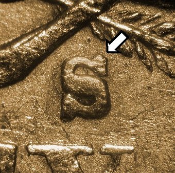 This reverse features a minor repunched S/S, with the mintmark closer to the arrow and branch than to the Y beneath it. The repunching is only noticed by a notch in the upper right serif.
