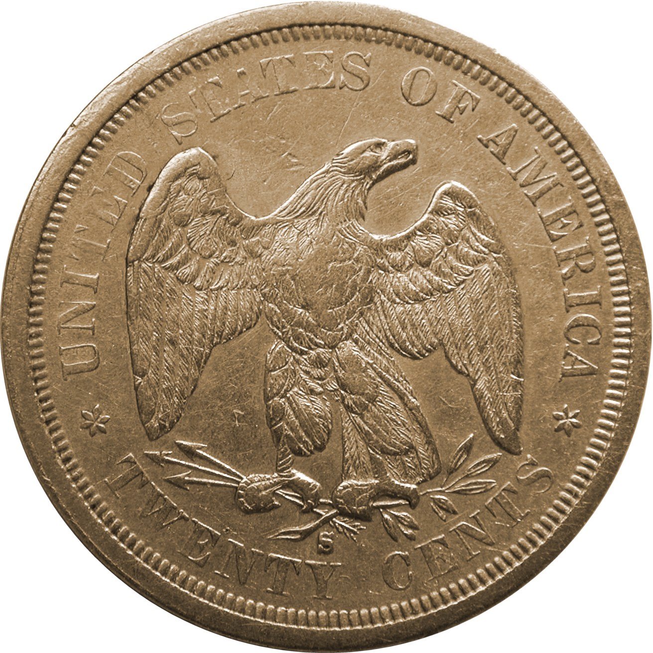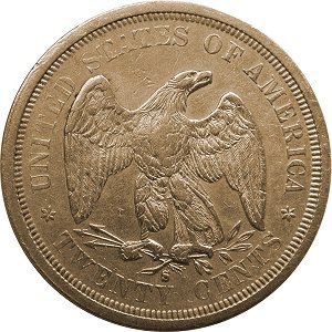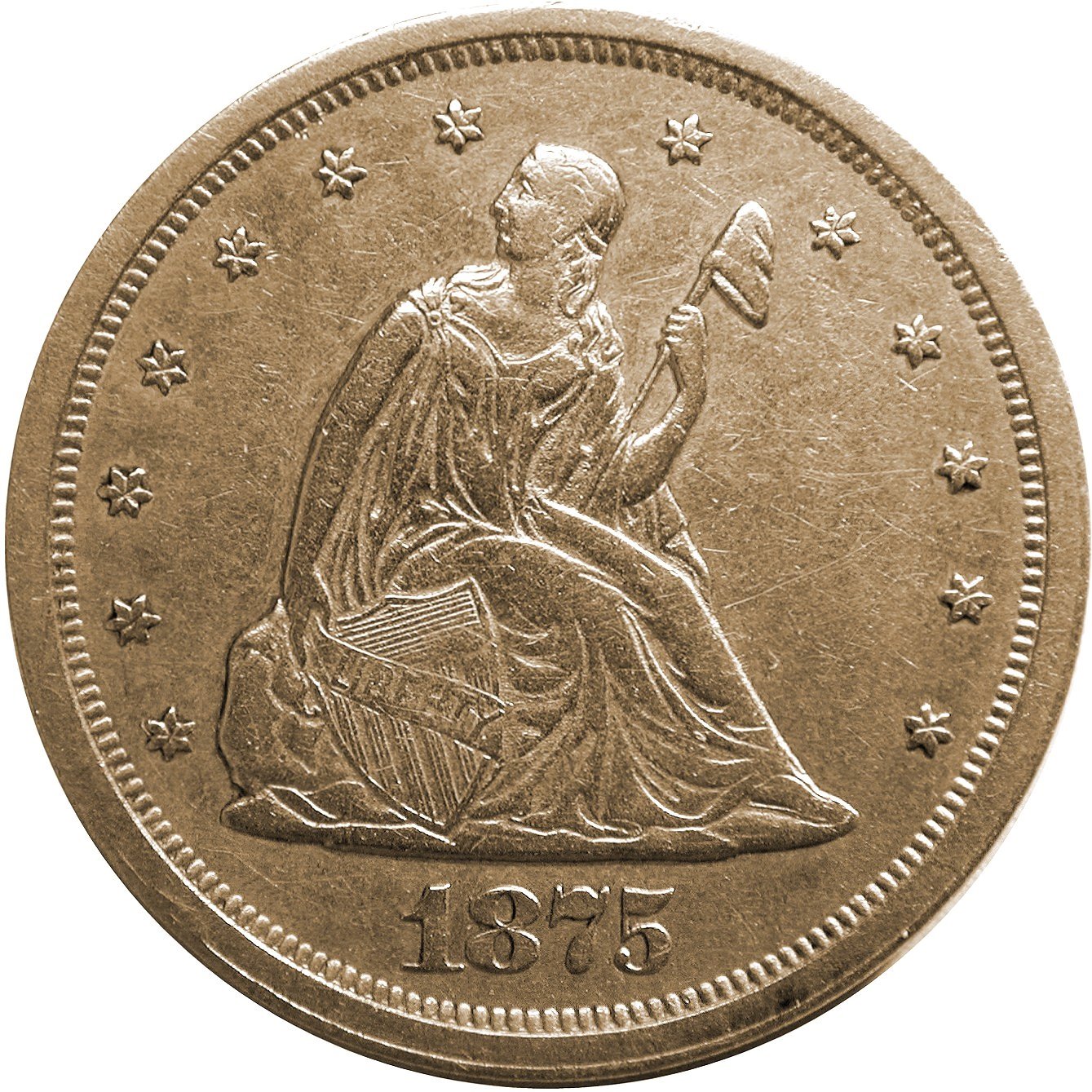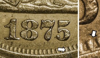 The right side of 1 in the date is under the shield point, and is the left-most date position of any of the obverse dies for the 1875-S. There is a diagonal line across a denticle below the 5.