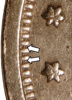 There is a curved die scratch in the denticles between stars 2 and 3, curving upward toward the field where it ends.