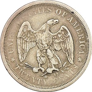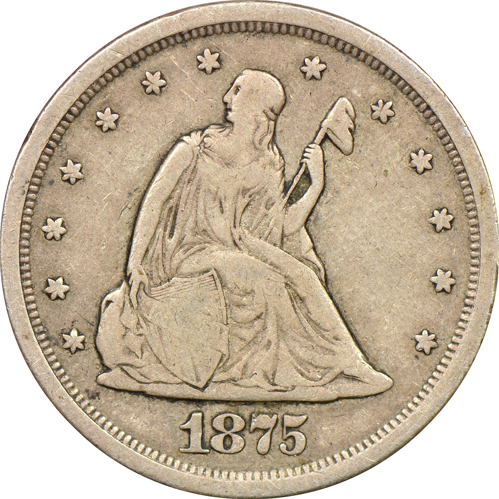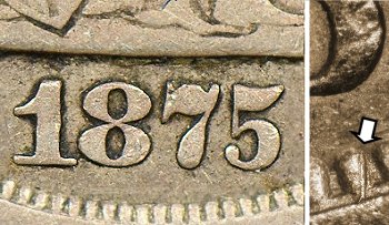 The right side of 1 in the date is under the shield point, and is the left-most date position of any of the obverse dies for the 1875-S. There is a diagonal line across a denticles below the 5.