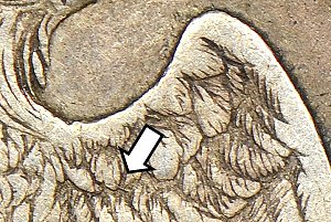 There is a die scratch in the eagle’s upper left wing (to the viewer’s right). It should be fairly easy to see even in moderately circulated examples (see both photos below).