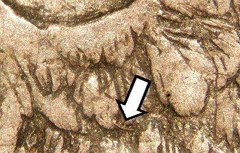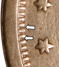 There is a curved die scratch in the denticles, beginning left of star 2, curving upward toward the field before it ends between stars 2 and 3. It is not as sharp as in BF-3 due to die wear.