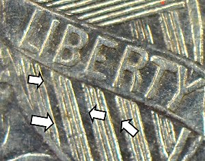 There is a series of horizontal die file marks or heavy die polish within the vertical stripes of the shield, below the ribbon with LIBERTY on it. This set of