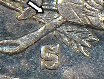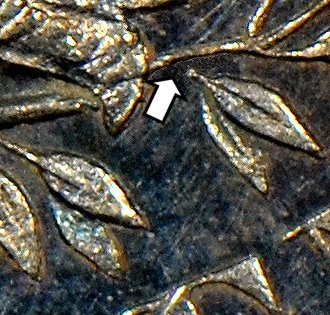 of the S are separated from the rest of their respective letters. The die lapping also weakened the nearby denticles.