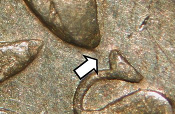 A die crack forms from the tip of the eagle’s left wing (right-facing) to the S in CENTS.