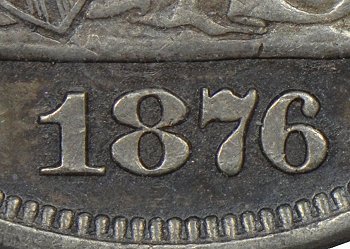 The 1 in the date is positioned about equally distant between the rock and the denticles. Top of the 1 is fully right of the shield point.