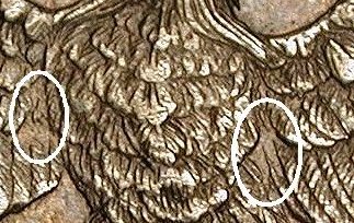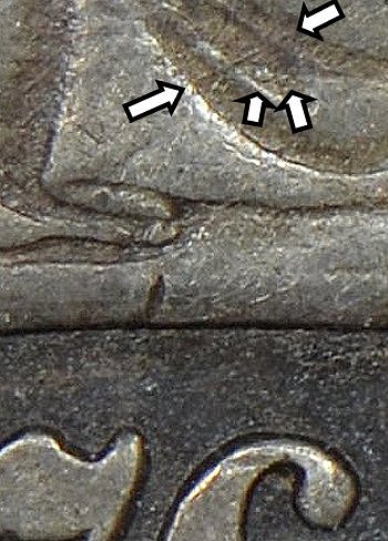 There are two raised lumps in the gown over the 6 in the date with a diagonal die line above the lumps.