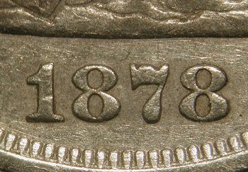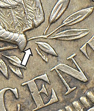 The two middle olive leaves above N in CENTS are disconnected from the branch due to over-polishing of the die.