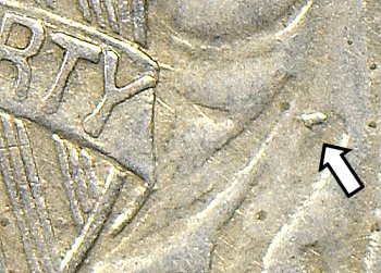 A raised lump is right of the shield due to a die gouge.