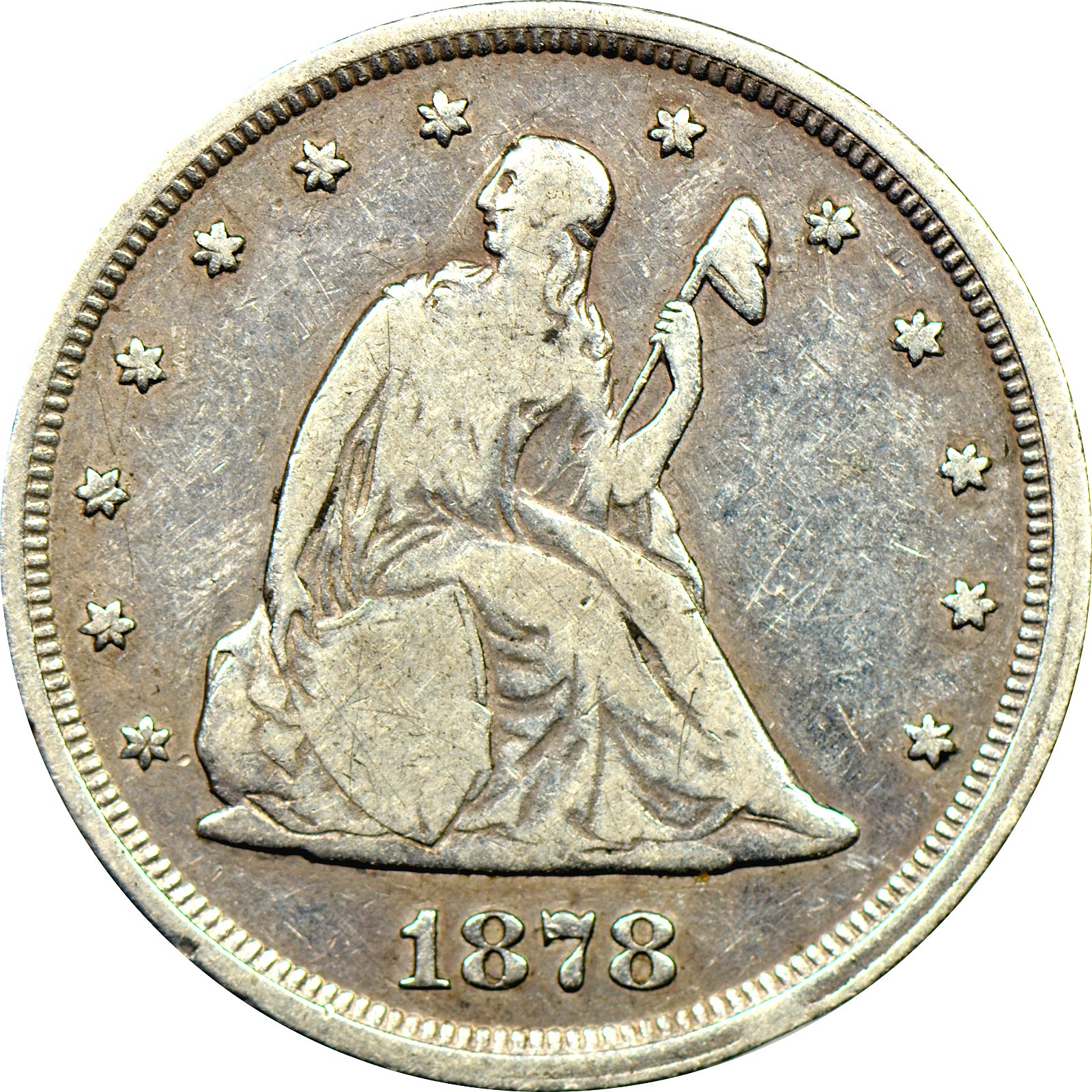Proof coins stuck in 1878 are very scarce, but not as much as the 1877 proof coins. The 1878 also can be found with circulation wear. Circulated proofs of this date are equal to the 1877 in