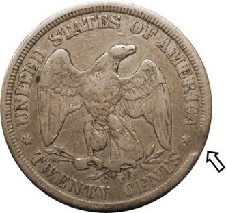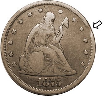 Clipped twenty-cent pieces are fairly rare with major clips being excessively rare. Below is an 1875-CC that exhibits a minor clip. Minor clips like the one below often go unnoticed