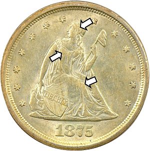 The particular high points to examine for wear are Liberty’s head and knees on the obverse and the eagle’s head, breast, legs and talons. Be careful to distinguish wear from a weak strike.