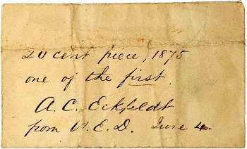 Pictured below is an original envelope that contained one of the first 1875 twenty-cent pieces struck. The envelope was presented to Adam C. Eckfeldt