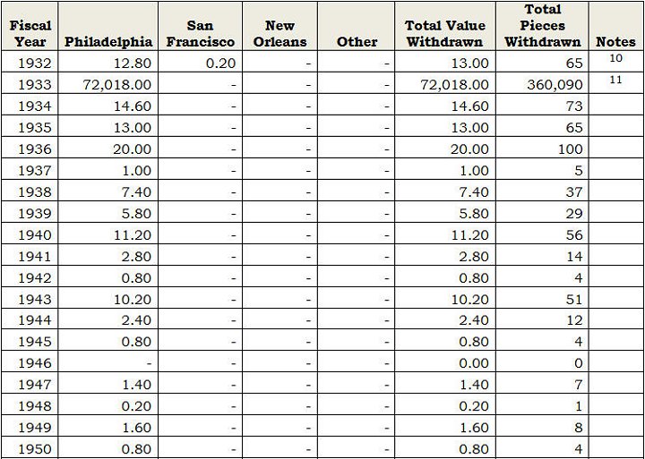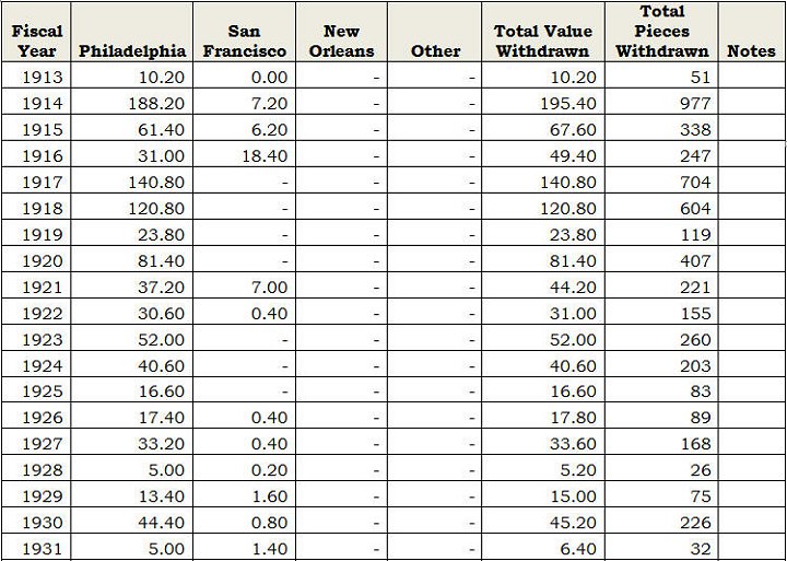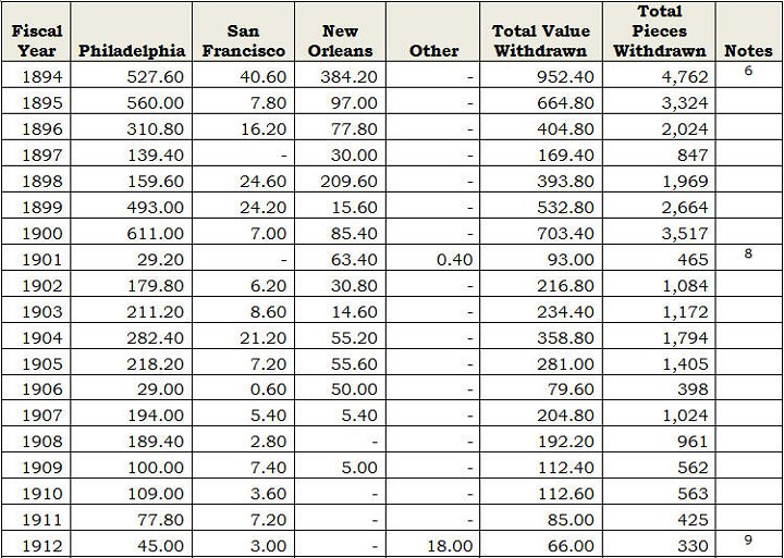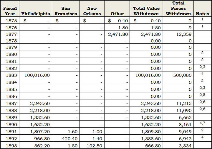 The following table details the years and locations of withdrawal of twenty-cent pieces by the Treasury, as listed in the Mint Director’s Reports. Note that these are locations of the withdrawal,