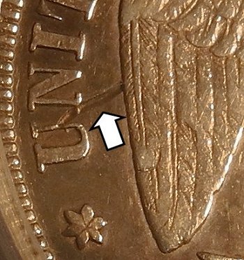 the planchet and die during striking. When this happens, the foreign object will be struck with the planchet, leaving an impression of the object on the finished coin. The object