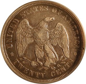 error on an 1875-P twenty-cent coin with the impression easily visible on the left side of the reverse.